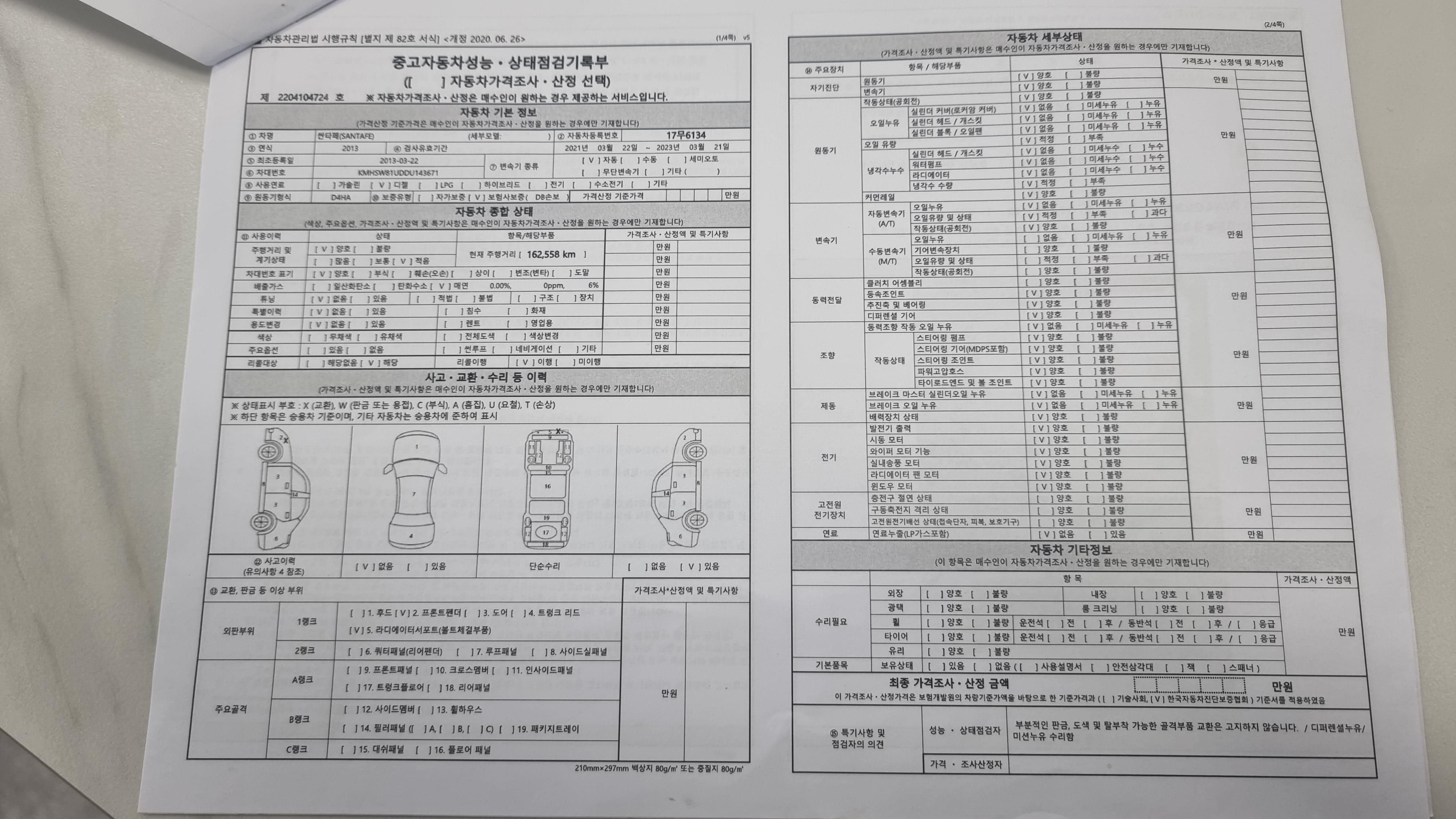 Hyundai Santafe DM Item Number : INR1674190037 Date : 2023-01-20 Hits : 91 Vehicle View Vehicle info media External device SunroofPower-Electric TrunkGhost Door ClosingElectric Folding Side MirrorAluminum WheelRoof RackHeadlamp [HID]Headlamp [LED] Internal device Power Door LockPower Steering WheelPower WindowElectrically Adjustable Steering WheelPaddle shiftSteering Wheel Remote ControlECM Room MirrorHigh PassHeated steering wheel Safety device Brake lock protection [ABS]Anti-lock braking [TCS]Air bag [Driver]Air bag [Passenger seat]Air bag [side]Air bag [curtain]Dynamic Stability Control [ESC]Tire pressure sensor [TPMS] Lane departure warning system [LDWS]Electronic control suspension [ECS]Blind-Spot Collision Warning SystemThe Rear camera360 degrees around viewThe parking sensor [Front]The parking sensor [Rear] Vehicle Convenience Multimedia Smart keyCruise Control [General]Cruise control [adaptive]Head Up Display [HUD]Electric Parking Brake [EPB]an automatic air conditionerWireless door lockRain sensorAutolight Curtain-blind [back seat]Curtain-blind [rear]NavigationFront seat AV monitorRear seat AV monitorUSB terminalAUX terminalBluetoothCD player Seat device Heated seat [front seat]Heated seat [back seat]a leather sheetElectric seat [driver's seat]Electric seat [passenger seat]Electric seat [rear seat] Ventilation seat [driver seat]Ventilation seat [passenger seat]Ventilation seat [rear seat]a Massage seatMemory seat [driver's seat]Memory seat [passenger seat] Condition Report No indication(normal) X (replacement)W (plate metal, weld)A (absorption)C (corrosion)U (convex)T (damage)F (bending)m (adjustment) Hyundai Santafe DM Status Sold out Type Car Domestic Make Hyundai Model Santa Fe Trim Santa Fe DM (12-15) Model Year 2013 Distance 162,597km Fuel Diesel Transmission Auto Color White Accident history Accidents Estimation $ 10,300 Request a Car LINK COPY